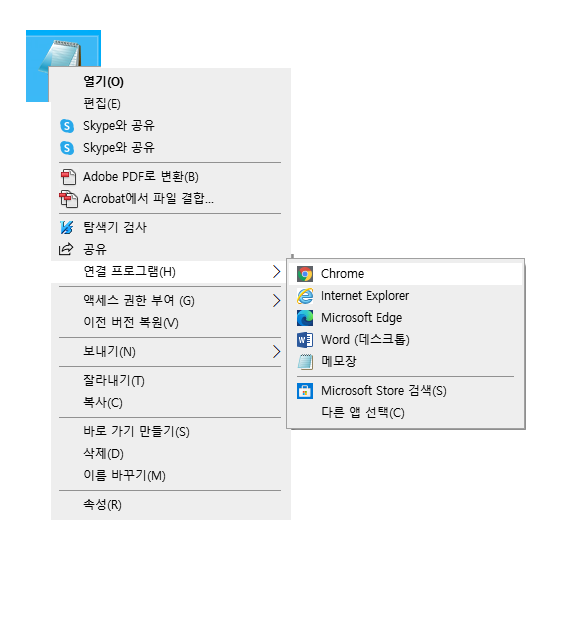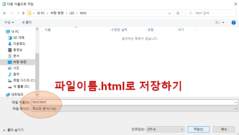 웹문서는 html 코드로 작성하였기 때문에, 저장할 때 파일 이름. txt로 저장하는 것이 아니고, 파일 이름. html로 작성하여야 합니다. 이때 웹문서를 보기 위해서는 파일을 오른쪽 마우스로 클릭하여 연결 탭에서 브라우저(익스플로러나 크롬)로 열어주면 작성한 웹문서를 볼 수 있습니다.