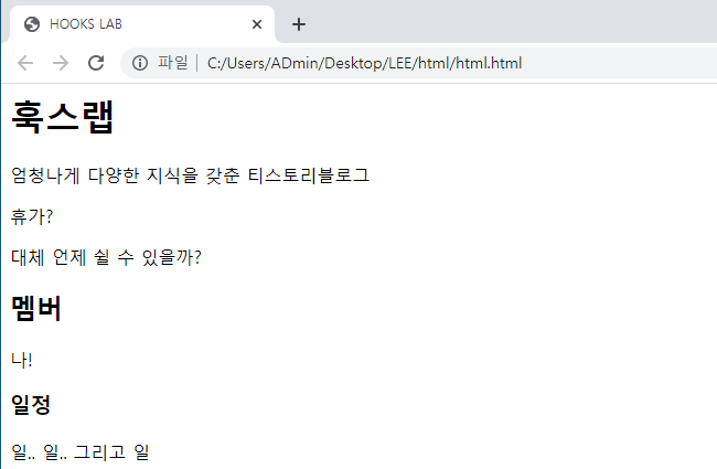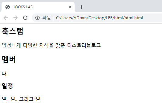 이것은 따로 스타일을 지정하지 않은 한 문단은 차례대로 나온다는 것을 의미합니다. 이후에 CSS(Cascading Style sheets) 포스팅에서 문단의 위치를 지정하는 것을 다루겠습니다.