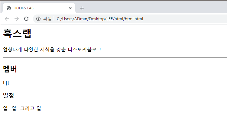 두 문단을 <hr>으로 구분하고 브라우저를 통해서 웹문서를 확인해보면 다음과 같은 결과를 얻습니다.