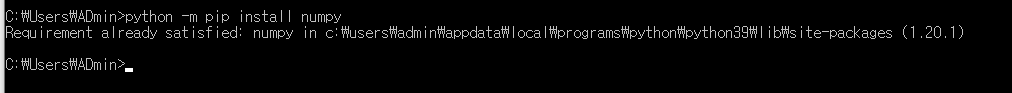 이 numpy 모듈이 random 함수를 사용하기 위한 모듈 이름입니다. 마찬가지로 이미 한번 설치한 적이 있어서 저렇게 결과가 나왔네요...