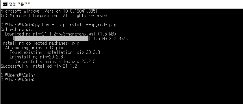 아마 다르게 나올 수 있지만, Successfully installed pip -... version 란을 보시면 설치가 됐다는 걸 알 수 있을 거예요.