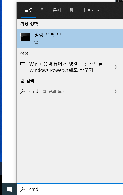 먼저 명령 프로픔트(cmd.exe)를 실행시켜야 합니다. 이 명령 프롬프트는 윈도즈 앱 검색에 cmd를 입력하여 찾을 수 있습니다. 다음의 그림을 참조해주세요.
