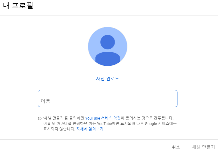 ㄹ. 그러면 프로필 설정화면이 뜹니다. 원하는 이름을 입력하고 채널만들기를 클릭해주세요.