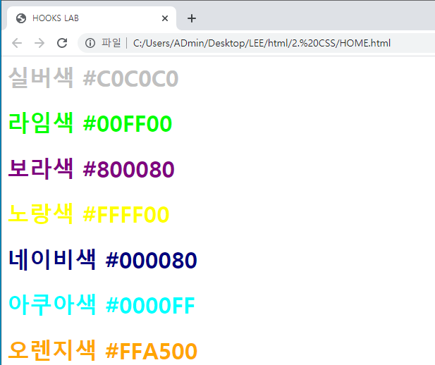 <span style ="color: Lime;"><h1> 라임색 #00FF00</h1></span>
