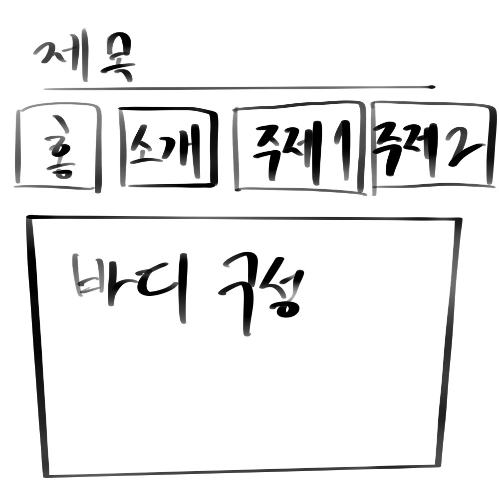 이렇게 디자인이 있으면 크게 홈페이지 제목 부분과 메뉴 부분, 그리고 바디의 속성에 맞는 웹 코드를 선언해야 합니다. 예시 코드로 다음과 같이 웹문서를 만들어봅시다.