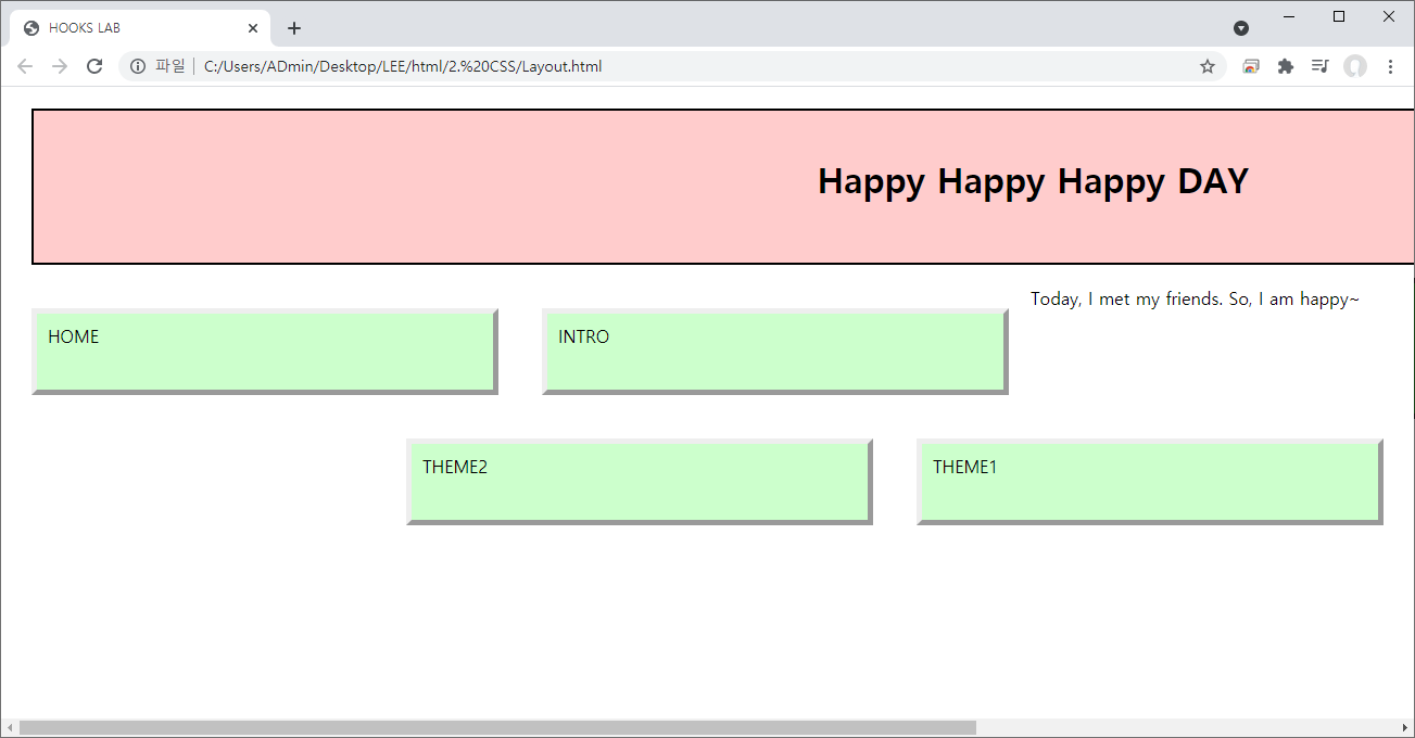 예시 코드를 자세히보시면, 바디에 구성한 내용은 메뉴 바로 옆에 붙어서 입력된 것을 볼 수 있습니다. 이렇게 통상적으로 위에서 아래로 그리고 왼쪽에서 아래로 차곡차곡 쌓여가는 요소들의 흐름을 flow라고 합니다.