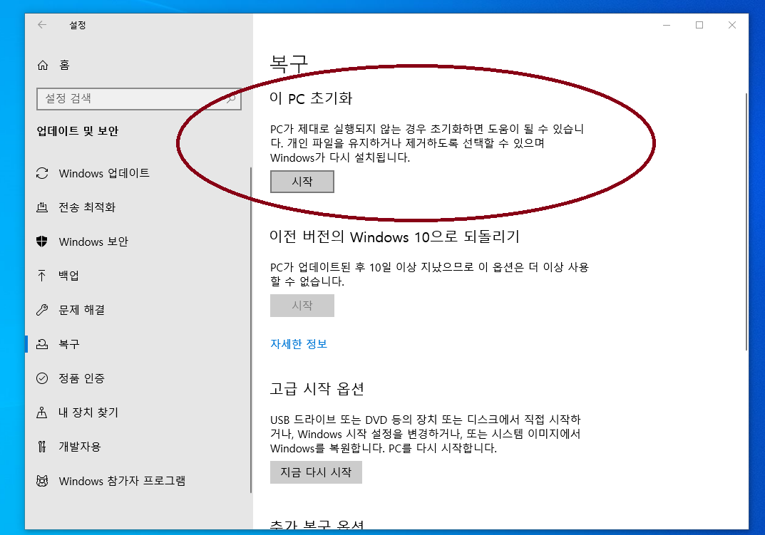 이 PC 초기화와 시작 버튼이 다음과 같이 뜨셨나요?