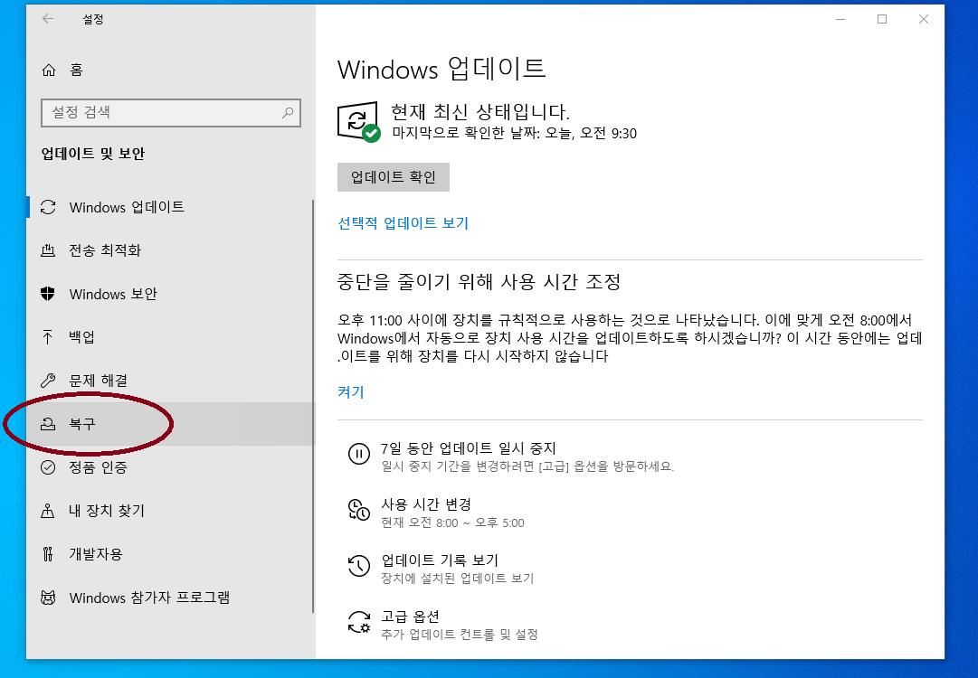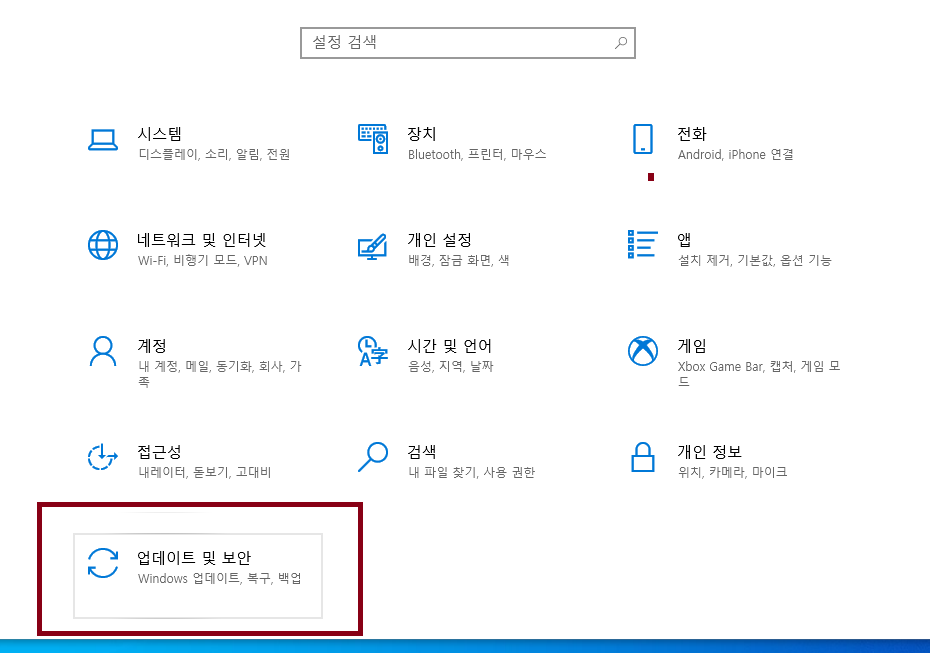 제일 마지막 항목은 업데이트 및 보안인데요, 요기를 클릭하시면 다음 단계로 진행할 수 있습니다.