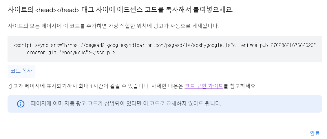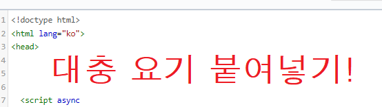 어려워하실 필요 없이 복사된 코드를 <head> 바로 앞에 붙여 넣어주세요!