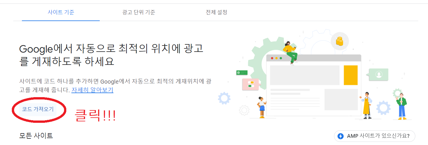 그러면 다음 화면이 뜨는데요, 광고 코드 가져오기는 다음의 사진에서 쉽게 찾으실 수 있어요!