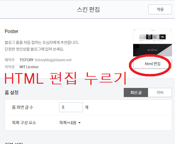 그리고 나오는 화면의 제일 오른쪽 상단에 보시면 html 편집 버튼이 다음과 같이 있을 거예요! 눌러주세요!