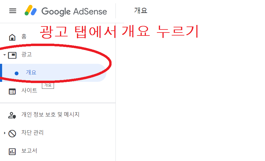 가장 먼저 아까와 같이 애드센스 홈페이지 로그인하면 나오는 화면 맨 왼쪽 탭에서 광고 - 개요 버튼을 눌러줍시다!
