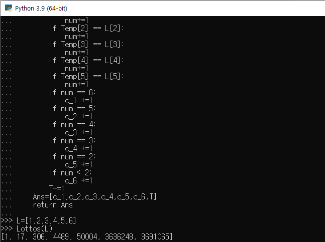 - 함수의 결과는 길이가 7인 리스트로 마지막 숫자의 의미는 1등이 나오기까지 시도한 총횟수이다.