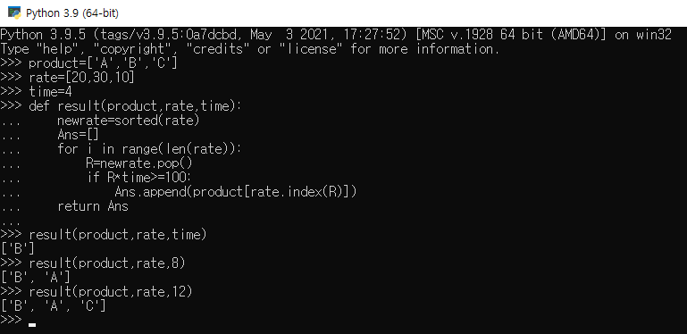 두 개의 리스트와 하나의 정수 데이터가 매개변수로 주어진다. 이때 하나의 리스트에는 생산되는 제품의 이름이 포함되어있고, 나머지 하나의 리스트에는 각 제품의 생산율을 백분율로 나타낸다. 1시간에 생산율만큼 제품이 생산된다고 할 때, 주어진 정수 시간만큼 지난 후에 생산되는 제품 순서대로 이름을 리스트 결과로 반환하는 프로그램을 만들어라.