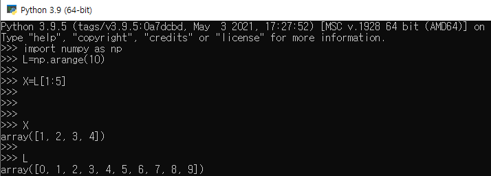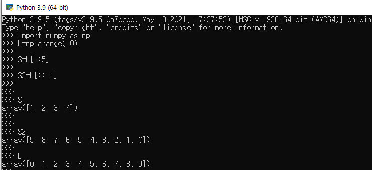 L 변수에 저장된 array 데이터를 조각 내버렸다. 결과를 보면 알겠지만, 인덱스를 기준 순서로 하여 데이터를 조각낸다. 이 슬라이싱 방법은 인덱스 순서를 일정 단계(step)를 가지는 순서로 조각낼 수 도 있다. 다음의 예시 코드를 참고하자.