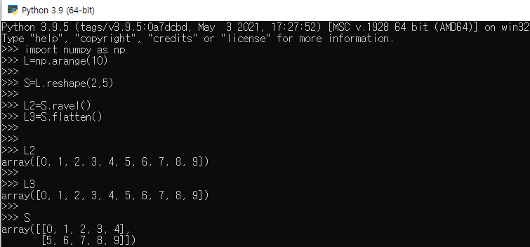 reshape 코드와 반대의 개념을 ravel() 혹은 flatten() 함수가 제공한다. 다음의 예시 코드로 분리된 배열들이 어떻게 합쳐지는지 이해하도록 하자.