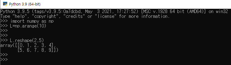 놀랍게도 배열이 2개로 분리되었다. 분리된 배열의 첫 번째 원소가 1차원 배열 [0,1,2,3,4]이고 두 번째 원소 역시 1차원 배열 [5,6,7,8,9]가 되는 것이다. 즉, reshape 코드의 첫 번째 숫자 2는 배열을 2개로 분리한다는 것을 의미하고, 두 번째 숫자 5는 분리된 배열이 가지는 원소 개수를 의미하게 된다. 주의할 점은 차원을 분리할 기존 배열의 원소 개수와 분리된 원소의 개수 총합이 정확히 맞아야 한다는 것이다.