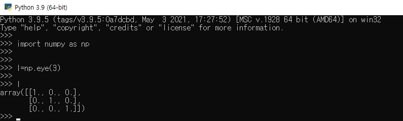 단위행렬은 행렬 계산에서 아주 유용하다. 넘 파이에서 단위행렬을 생성하려면 다음과 같은 예시 코드를 사용하면 된다.