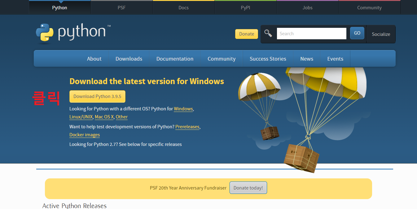 기타 리눅스나 맥 OS 사용자 분들은 Downloads 탭에서 각 윈도우즈에 맞는 버전의 파이썬을 다운로드할 수 있습니다.