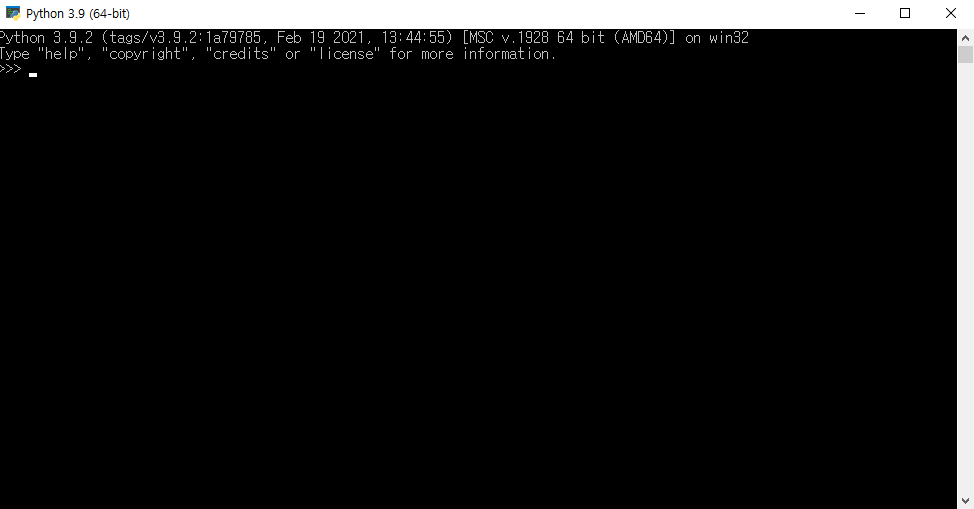 파이썬의 설치가 다 끝나고 프로그램을 실행시키면 다음과 같은 명령창이 나옵니다.