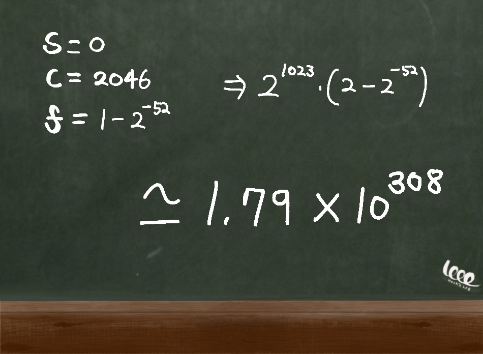 즉, 부동 소수가 양수에서 가장 큰 수가 될 수 있는 경우는 s,c 그리고 f 가 각각 0,2046, 1-2-52일때이다.